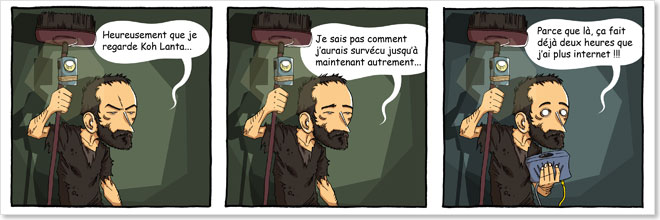 La vie moderne nous a donn? des habitudes dont on ne saurait plus se passer... Par exemple, quelqu'un se souvient-il de l'?poque, pas si lointaine parait-il, o? nous n'avions pas encore de t?l?phone portable ? Cette semaine, un petit clin d'oeil compatissant ? mon cyber-pote Bunta qui, coup? du monde, ne donne plus de nouvelles depuis plusieurs jours... Pour les amateurs d'humour noir soigneusement trash, je vous en conseille n?anmoins vivement le blog ! Courage Bunta !