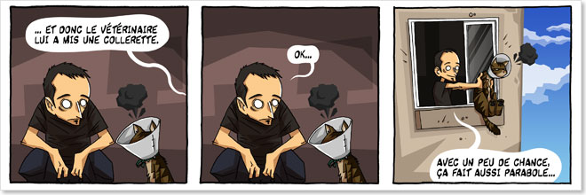 Et une pens?e quand m?me pour ce pauvre chat qui se tape deux cachetons d'antibiotiques et deux d?sinfections par jour en entamant sa deuxi?me semaine de collerette ? se prendre tous les murs...