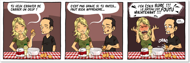 J'ai la chance d'avoir une ch?rie qui cuisine bien. Parfois, je me dis que ce serait sympa de pouvoir l'aider... En m?me temps, dans une cuisine, ? part ouvrir des conserves et faire chauffer l'eau des p?tes... je sais pas faire grand chose... Mais heureusement, j'ai le droit ? des cours particuliers dont la p?dagogie est elle-m?me particuli?re !!! Super motivant...