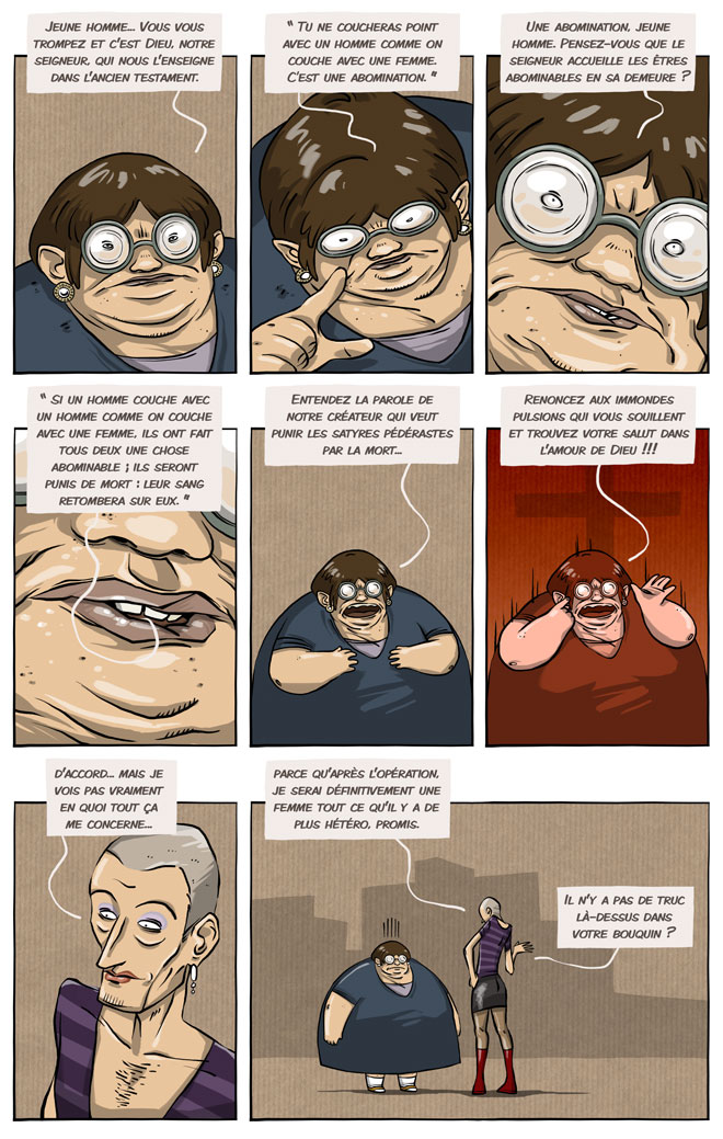 Je pr?cise que les abominations que la bonne femme vocif?re sont v?ritablement extraites de l'ancien testament, ce truc poussi?reux qui est ? la base des trois principales religions monoth?istes qui aiment ? nous casser les couilles.
